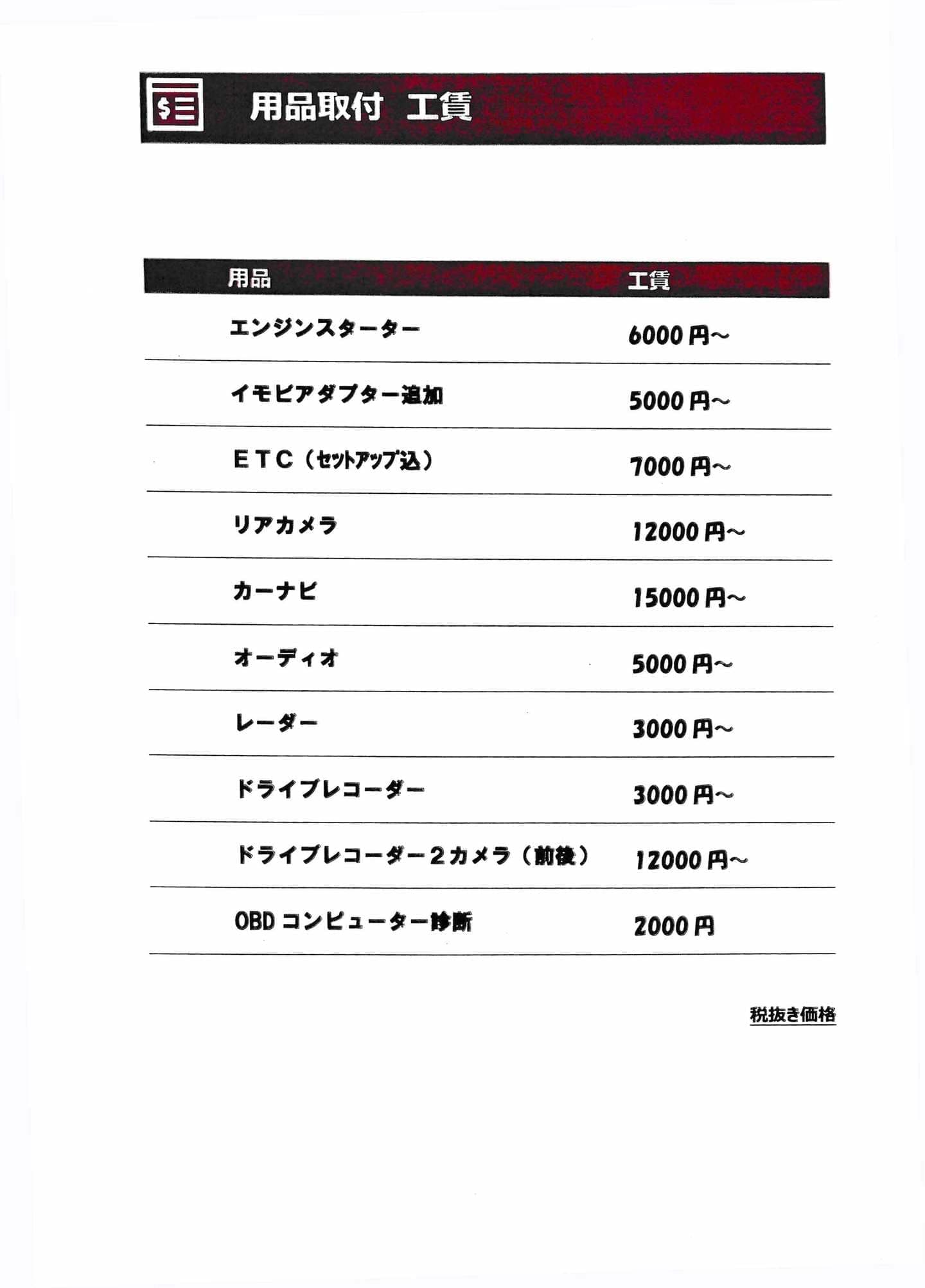 アクセサリー取付工賃